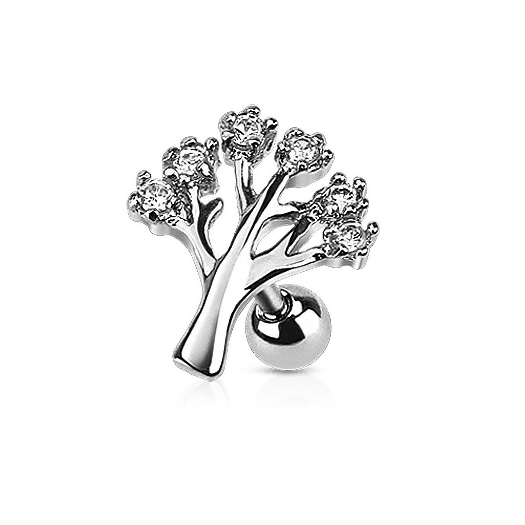 Piercing za tragus v obliki cvetoče vej z belimi kristalčki.